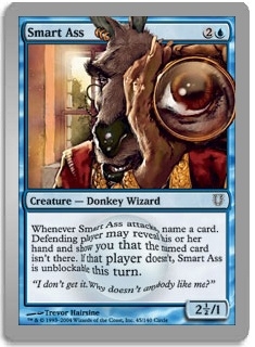 Whenever Smart Ass attacks, name a card. Defending player may reveal his or her hand and show you that the named card isn't there. If that player doesn't, Smart Ass is unblockable this turn.