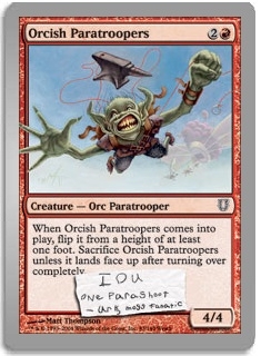 When Orcish Paratroopers comes into play, flip it from a height of at least one foot. Sacrifice Orcish Paratroopers unless it lands face up after turning over completely.