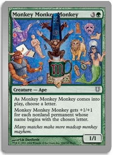 As Monkey Monkey Monkey comes into play, choose a letter. Monkey Monkey Monkey gets +1/+1 for each nonland permanent whose name begins with the chosen letter.
