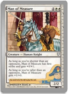 As long as you're shorter than an opponent, Man of Measure has first strike and gets +0/+1. As long as you're taller than an opponent, Man of Measure gets +1/+0.