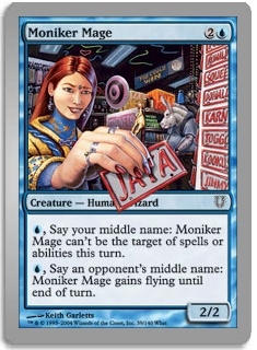 U, Say your middle name: Moniker Mage can't be the target of spells or abilities this turn. U, Say an opponent's middle name: Moniker Mage gains flying until end of turn.