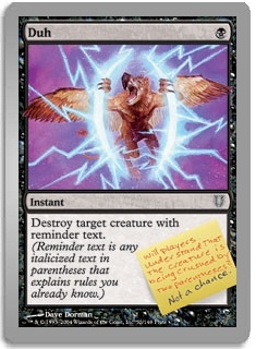 Destroy target creature with reminder text. (Reminder text is any italicized text in parentheses that explains rules you already know.)