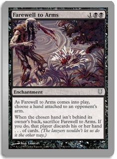 As Farewell to Arms comes into play, choose a hand attached to an opponent's arm. When the chosen hand isn't behind its owner's back, sacrifice Farewell to Arms. If you do, that player discards his or her hand . . . of cards. (The lawyers wouldn't let us do it the other way.)