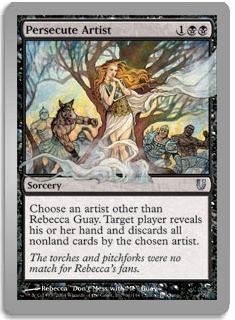 Choose an artist other than Rebecca Guay. Target player reveals his or her hand and discards all nonland cards by the chosen artist.