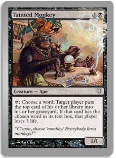 Tap: Choose a word. Target player puts the top card of his or her library into his or her graveyard. If that card has the chosen word in its text box, that player loses 3 life.