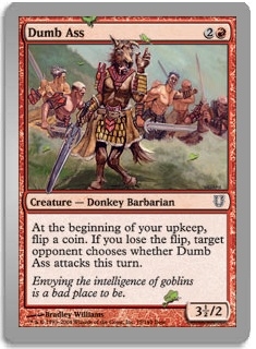 At the beginning of your upkeep, flip a coin. If you lose the flip, target opponent chooses whether Dumb Ass attacks this turn.