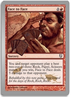 You and target opponent play a best two-out-of-three Rock, Paper, Scissors match. If you win, Face to Face deals 5 damage to that opponent.