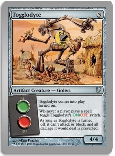 Togglodyte comes into play turned on. Whenever a player plays a spell, toggle Togglodyte's ON/OFF switch. As long as Togglodyte is turned off, it can't attack or block, and all damage it would deal is prevented.