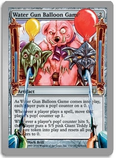 As Water Gun Balloon Game comes into play, each player puts a pop! counter on a 0. Whenever a player plays a spell, move that player's pop! counter up 1. Whenever a player's pop! counter hits 5, that player puts a 5/5 pink Giant Teddy Bear creature token into play and resets all pop! counters to 0.