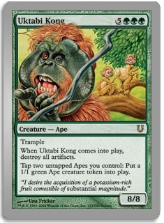 Trample When Uktabi Kong comes into play, destroy all artifacts. Tap two untapped Apes you control: Put a 1/1 green Ape creature token into play.