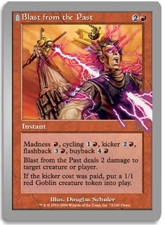 Madness R, cycling 1R, kicker 2R, flashback 1R, buyback 4R Blast from the Past deals 2 damage to target creature or player. If the kicker cost was paid, put a 1/1 red Goblin creature token into play.