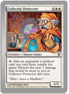 W, Give an opponent a nonland card you own from outside the game: Prevent the next 1 damage that would be dealt to you or Collector Protector this turn.
