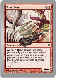 As Six-y Beast comes into play, you secretly put six or fewer +1/+1 counters on it, then an opponent guesses the number of counters. If that player guesses right, sacrifice Six-y Beast.