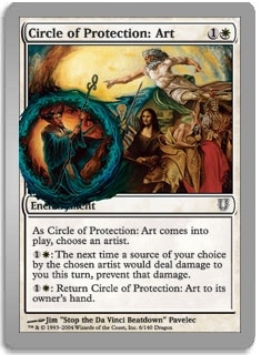 As Circle of Protection: Art comes into play, choose an artist. 1W: The next time a source of your choice by the chosen artist would deal damage to you this turn, prevent that damage. 1W: Return Circle of Protection: Art to its owner's hand.