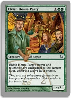 Elvish House Party's power and toughness are each equal to the current hour, using the twelve-hour system.