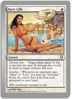 Choose one - Target player gains 2½ life; or prevent the next 2½ damage that would be dealt to target creature this turn. Gotcha - Whenever an opponent says "Save" or "Life," you may say "Gotcha!" If you do, return Save Life from your graveyard to your hand.