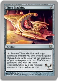 Tap: Remove Time Machine and target nontoken creature you own from the game. Return both cards to play at the beginning of your upkeep on your turn X of the next game you play with the same opponent, where X is the removed creature's converted mana cost.