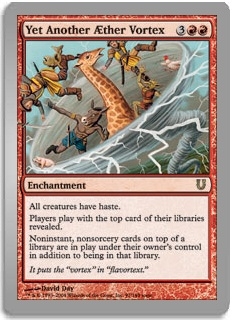 All creatures have haste. Players play with the top card of their libraries revealed. Noninstant, nonsorcery cards on top of a library are in play under their owner's control in addition to being in that library.