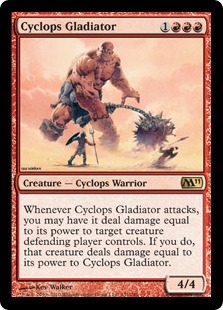 Whenever Cyclops Gladiator attacks, you may have it deal damage equal to its power to target creature defending player controls. If you do, that creature deals damage equal to its power to Cyclops Gladiator.