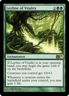 If Leyline of Vitality is in your opening hand, you may begin the game with it on the battlefield. Creatures you control get +0/+1. Whenever a creature enters the battlefield under your control, you may gain 1 life.