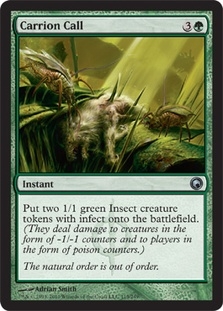 Put two 1/1 green Insect creature tokens with infect onto the battlefield. (They deal damage to creatures in the form of -1/-1 counters and to players in the form of poison counters.)