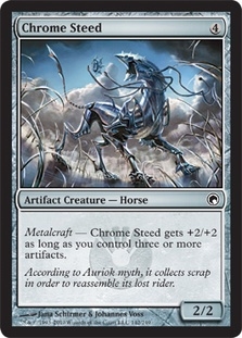 Metalcraft - Chrome Steed gets +2/+2 as long as you control three or more artifacts.