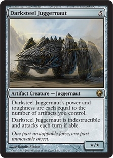 Darksteel Juggernaut's power and toughness are each equal to the number of artifacts you control. Darksteel Juggernaut is indestructible and attacks each turn if able.