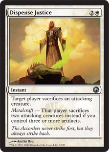 Target player sacrifices an attacking creature. Metalcraft - That player sacrifices two attacking creatures instead if you control three or more artifacts.