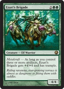 Metalcraft - As long as you control three or more artifacts, Ezuri's Brigade gets +4/+4 and has trample.