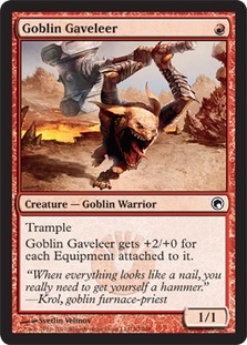 Trample Goblin Gaveleer gets +2/+0 for each Equipment attached to it.