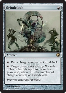 Tap: Put a charge counter on Grindclock. Tap: Target player puts the top X cards of his or her library into his or her graveyard, where X is the number of charge counters on Grindclock.