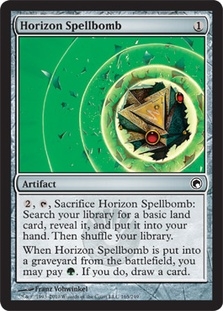 2, Tap, Sacrifice Horizon Spellbomb: Search your library for a basic land card, reveal it, and put it into your hand. Then shuffle your library.