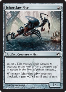 Infect (This creature deals damage to creatures in the form of -1/-1 counters and to players in the form of poison counters.) Whenever Ichorclaw Myr becomes blocked, it gets +2/+2 until end of turn.