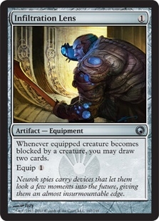 Whenever equipped creature becomes blocked by a creature, you may draw two cards. Equip 1