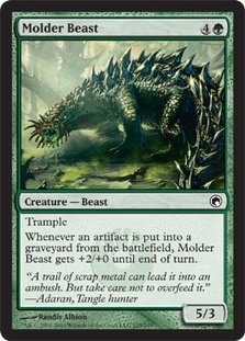 Trample Whenever an artifact is put into a graveyard from the battlefield, Molder Beast gets +2/+0 until end of turn.