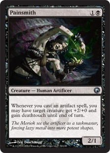 Whenever you cast an artifact spell, you may have target creature get +2/+0 and gain deathtouch until end of turn.