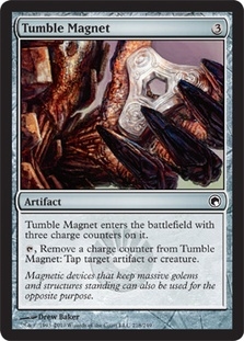 Tumble Magnet enters the battlefield with three charge counters on it. Tap, Remove a charge counter from Tumble Magnet: Tap target artifact or creature.