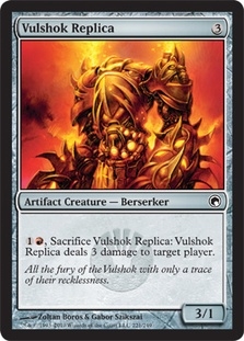 1R, Sacrifice Vulshok Replica: Vulshok Replica deals 3 damage to target player.