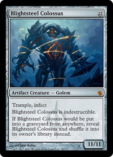 Trample, infect Blightsteel Colossus is indestructible. If Blightsteel Colossus would be put into a graveyard from anywhere, reveal Blightsteel Colossus and shuffle it into its owner's library instead.