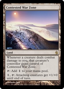 Whenever a creature deals combat damage to you, that creature's controller gains control of Contested War Zone. Tap: Add 1 to your mana pool. 1, Tap: Attacking creatures get +1/+0 until end of turn.