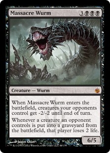 When Massacre Wurm enters the battlefield, creatures your opponents control get -2/-2 until end of turn. Whenever a creature an opponent controls is put into a graveyard from the battlefield, that player loses 2 life.
