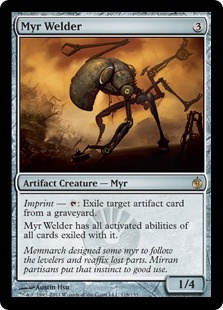 Imprint - Tap: Exile target artifact card from a graveyard. Myr Welder has all activated abilities of all cards exiled with it.