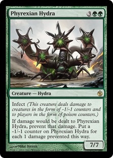 Infect (This creature deals damage to creatures in the form of -1/-1 counters and to players in the form of poison counters.) If damage would be dealt to Phyrexian Hydra, prevent that damage. Put a -1/-1 counter on Phyrexian Hydra for each 1 damage prevented this way.