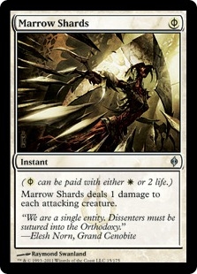 (w/p can be paid with either W or 2 life.) Marrow Shards deals 1 damage to each attacking creature.