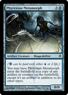 (u/p can be paid with either U or 2 life.) You may have Phyrexian Metamorph enter the battlefield as a copy of any artifact or creature on the battlefield, except it's an artifact in addition to its other types.