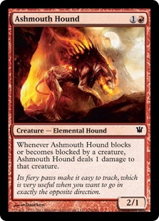 Whenever Ashmouth Hound blocks or becomes blocked by a creature, Ashmouth Hound deals 1 damage to that creature.
