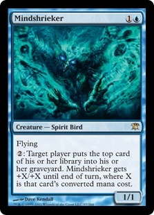 Flying 2: Target player puts the top card of his or her library into his or her graveyard. Mindshrieker gets +X/+X until end of turn, where X is that card's converted mana cost.