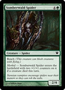 Reach (This creature can block creatures with flying.) Morbid - Somberwald Spider enters the battlefield with two +1/+1 counters on it if a creature died this turn.