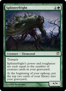 Trample Splinterfright's power and toughness are each equal to the number of creature cards in your graveyard. At the beginning of your upkeep, put the top two cards of your library into your graveyard.