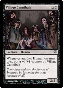Whenever another Human creature dies, put a +1/+1 counter on Village Cannibals.
